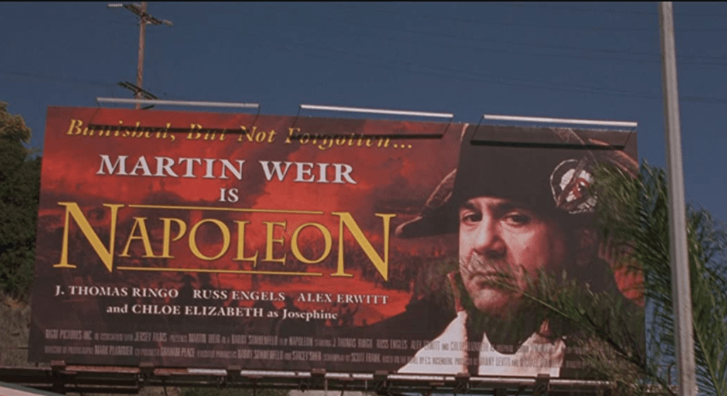 There are also references to fake movies, many of them in the filmography of the celebrated actor Martin Weir (Danny De Vito), who is riding high with his starring turn in the prestige picture Napoleon. Out for a meal with producer Harry Zinn (Gene Hackman), Chili spots Weir at a hip eatery: